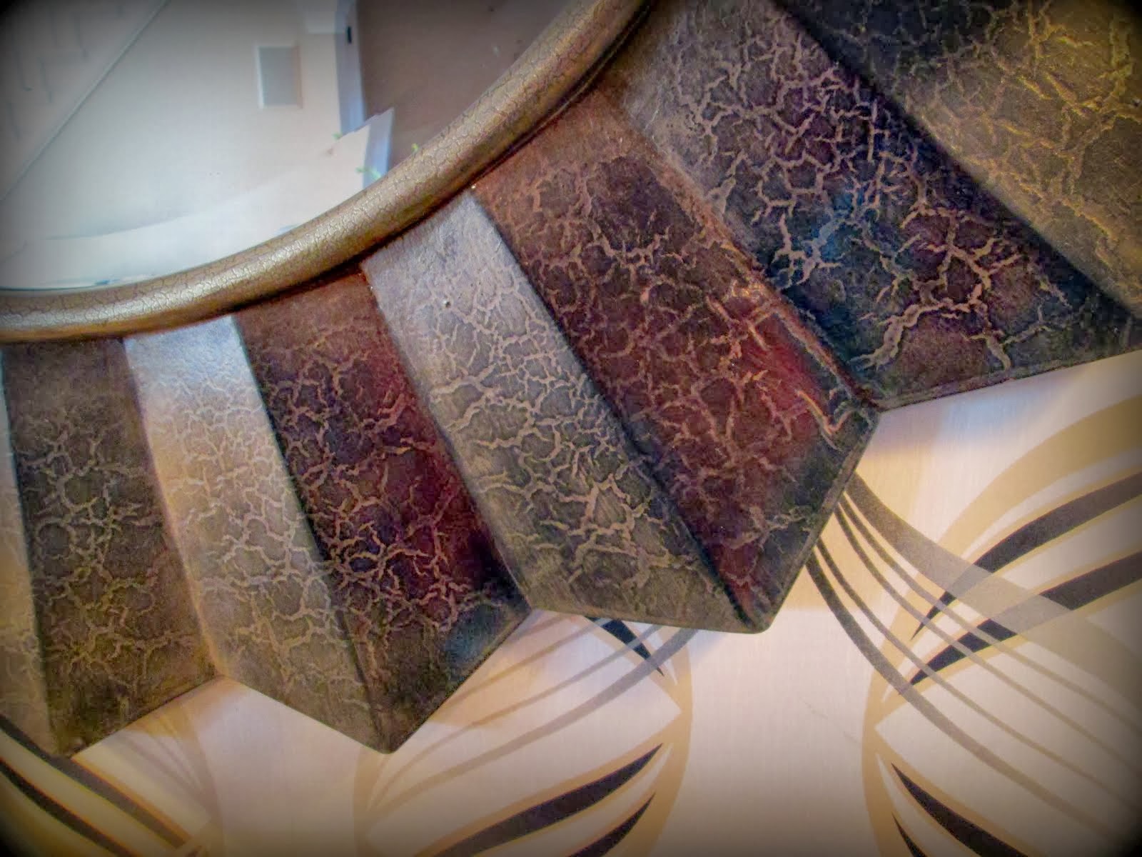 The buffet table was already custom painted in the gorgeous grey wash but lacked deep focal points. Deep glaze brought out more dimension. Metallics were added to the trim and door knobs for balance and to work cohesively with the crackled, hand-painted mirror above.